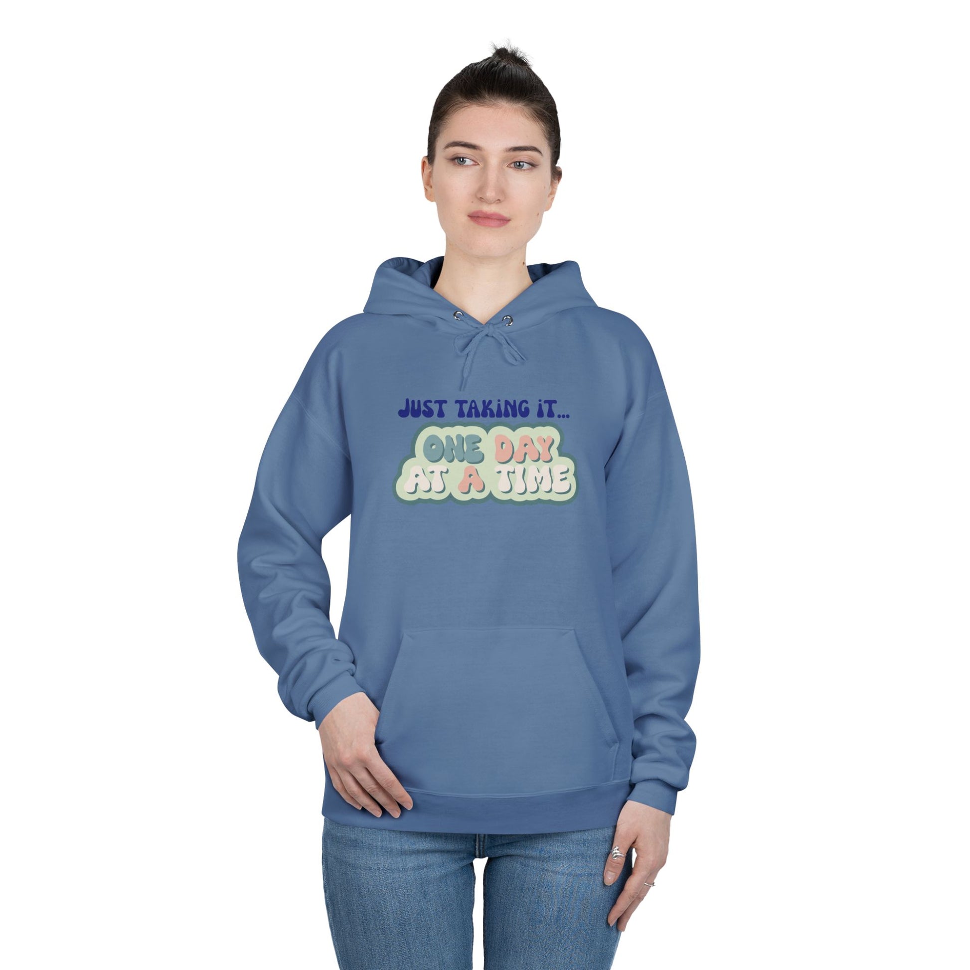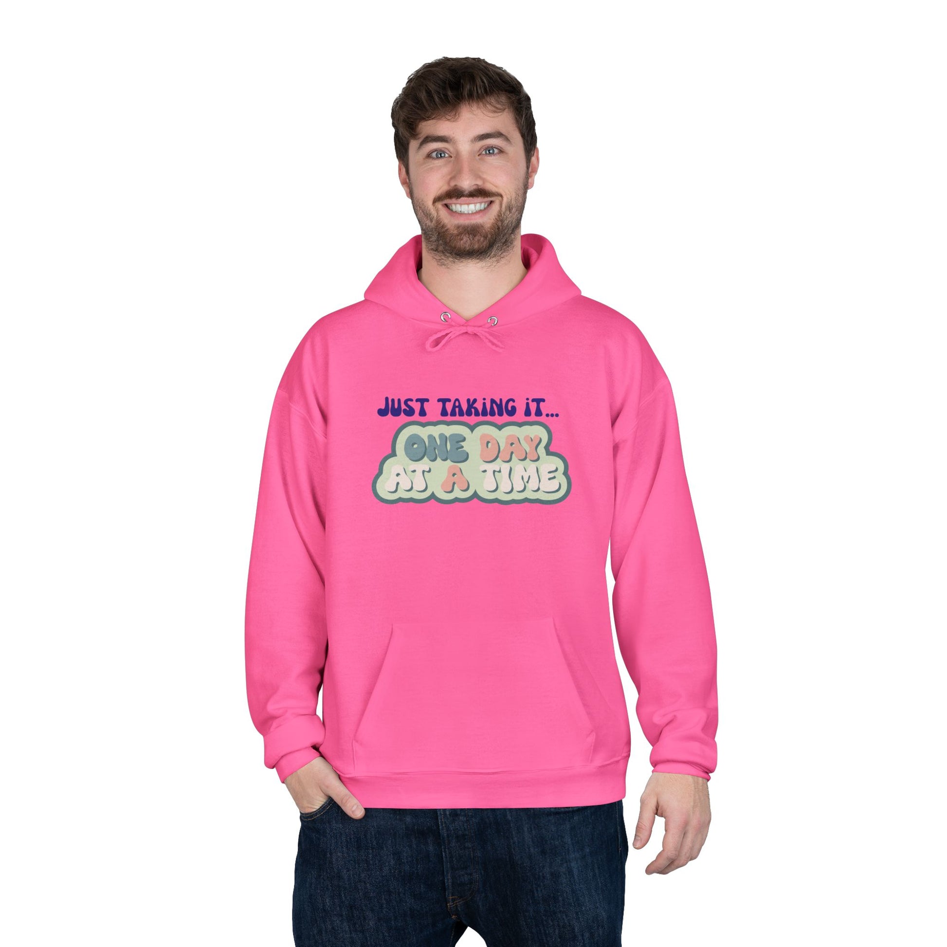 Step into comfort with this Unisex EcoSmart® Pullover Hoodie Sweatshirt, designed to be both stylish and sustainable. The soft fleece lining envelops you in warmth, making it perfect for lounging at home or heading out on a cool day. With an uplifting phrase like “Just taking it one day at a time,” this hoodie promotes a positive vibe, encouraging mindfulness and relaxation. Ideal for anyone seeking to blend comfort with a thoughtful message, it's perfect for casual gatherings, cozy evenings, or simply enjoying life’s small moments. This product is a great fit for celebrations like birthdays, Friendsgiving, or even just a self-care day, making it a thoughtful gift for friends and family who appreciate both style and sustainability.